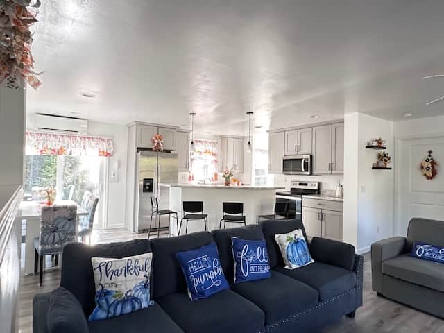 Step into a space designed for both relaxation and togetherness. The living room features a large window that bring the views inside, filling the room with natural light. An electric fireplace creates a cozy centerpiece—perfect for curling up with a book, enjoying movie nights, or gathering after a day of exploring Acadia.