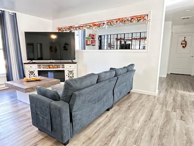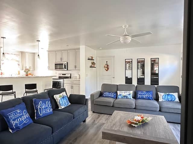 Furnished with two large sofas with seating for up to 8 guests, the room is thoughtfully arranged for effortless gatherings. A 75 inch smart TV and carefully curated décor add a touch of modern luxury, blending style with convenience. Whether enjoying morning coffee in a sunlit setting or an evening glass of wine by the fire, the living room offers a sanctuary of comfort and elegance.